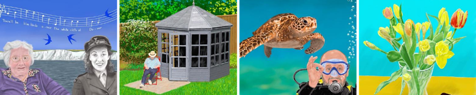 “I sketched the one of John and Celia after Ellie, the Administrator here at Westbourne House, had asked me if I could just do a sketch of Westbourne House. I said yes, but I thought it was a bit boring, so I thought I’d add one or two of the residents outside in the foreground. I knew that there was a photograph of John and Celia back in 1945 when they first met on our Facebook page and I thought ‘perfect!’. We re-created their stances and placed them side-by-side with their younger selves in the foreground of the House. It really struck a chord with them, they were pleased to do it and absolutely delighted with the result.