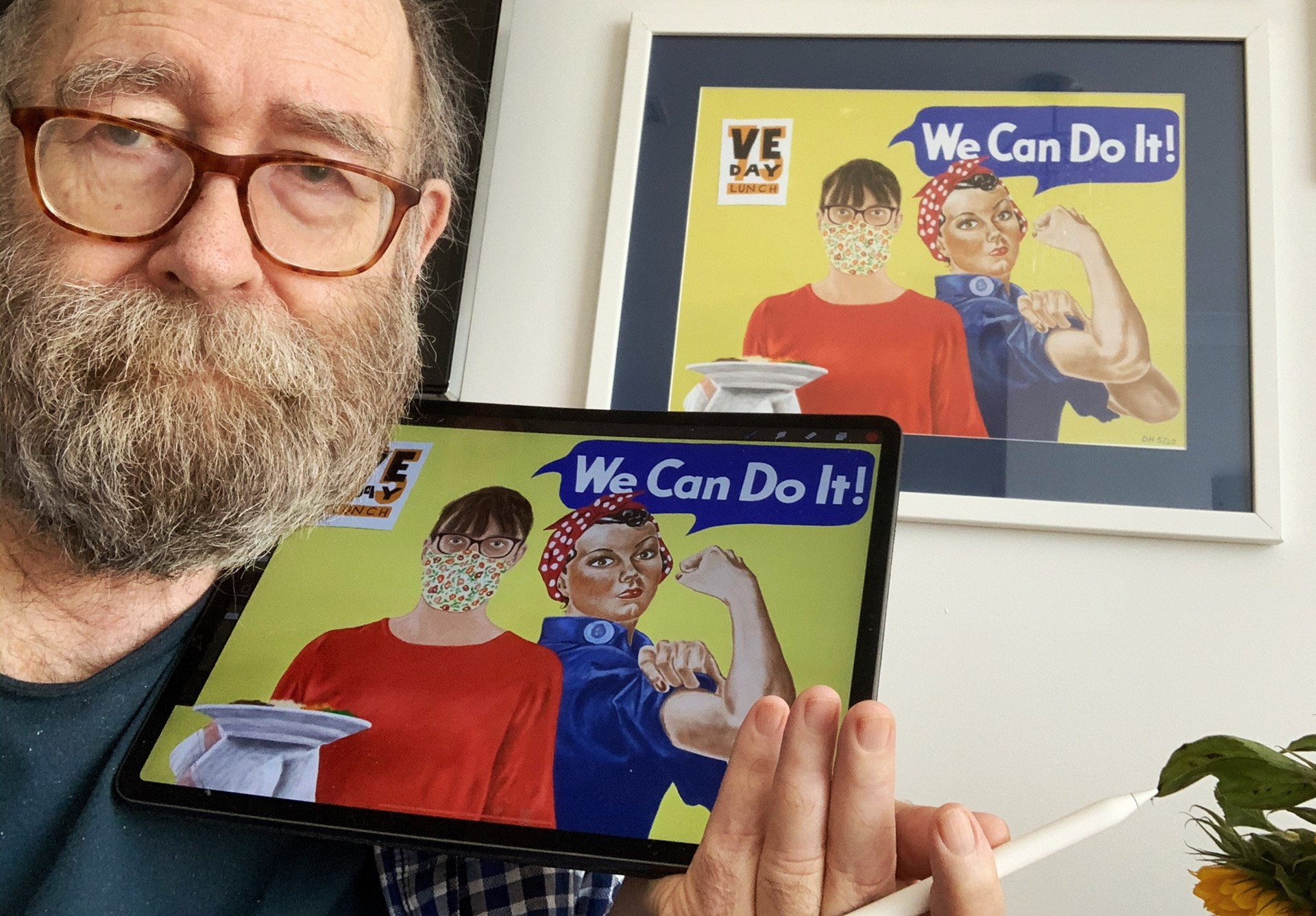 (Above: David holding his iPad next to his sketch of Jo in her mask during the VE Day lunch at Westbourne House)