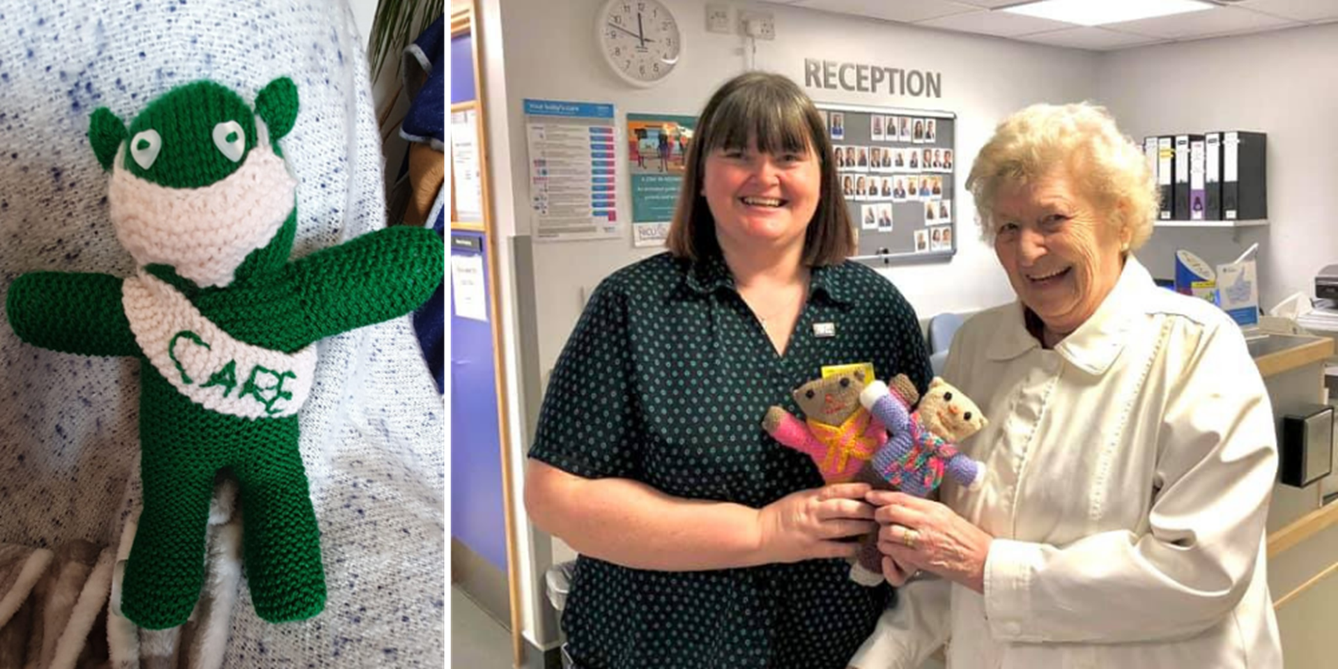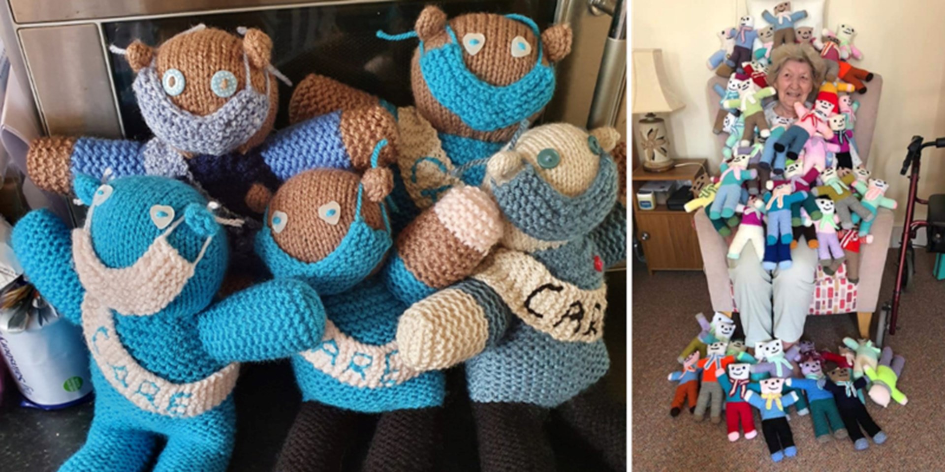 Debbie says, “Edna has been very generous and has donated them to her follow residents and our staff team, and our families too – even people just passing by the window have got one! I’ve also followed in her footsteps and made about 50, including some ‘care bears’ for my colleagues in full uniform and PPE. Edna is very quick and could probably knit them in her sleep. She is even knitting in our video tour of the home on our website – you can see some of her teddies, and you can also see me trying to keep up!”