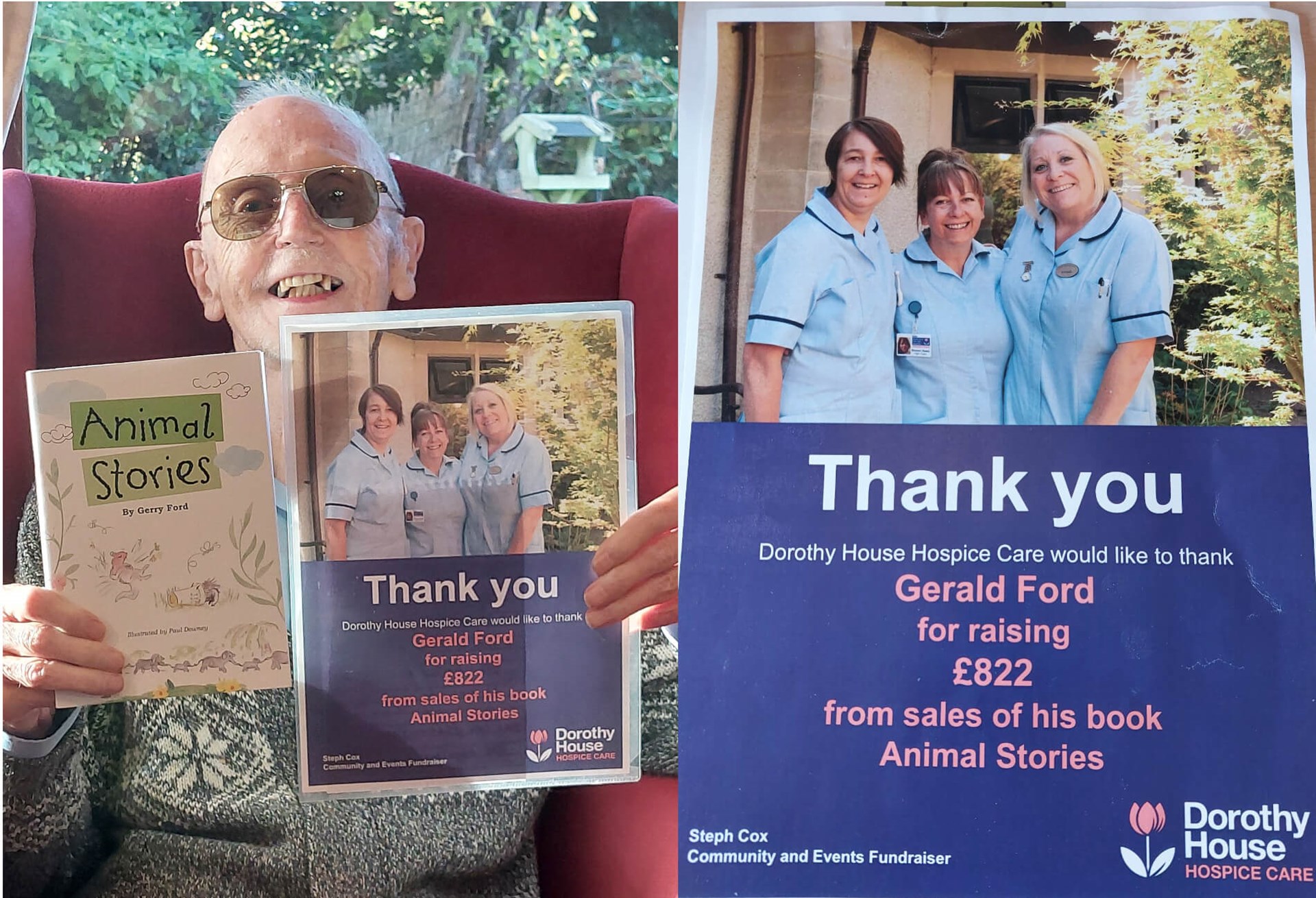 Gerry says, “My wife, Barbara, sadly had a brain tumour. The staff at Dorothy House looked after her day and night at the end of her life, so £2 from each books goes to them. My certificate says £822 has been raised, but I’ve actually gone past £1,000 now and counting.”