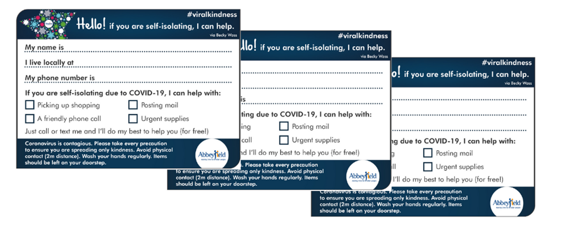 Older people are among those who have been advised to stay at home and with that, they may be feeling uncertain. So, how can we support older relatives, friends and neighbours in the community? With special thanks to Becky Wass for allowing us to use her intuitive #viralkindness campaign, we have designed some support cards that you can use to help older people this Christmas.