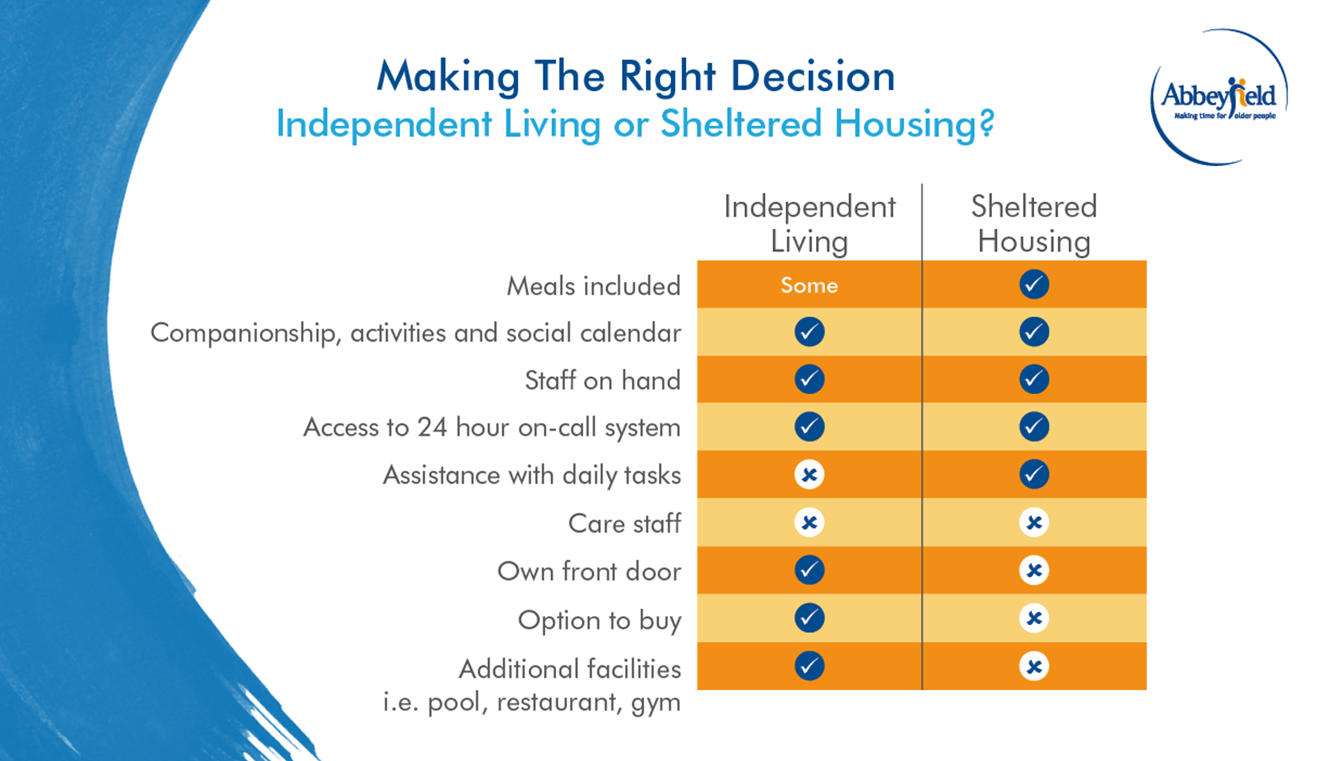 - Budget: evaluate your finances and the cost of each option. Sheltered housing at Abbeyfield can often be cheaper as the monthly rental cost typically includes meals, council tax and utilities bills.