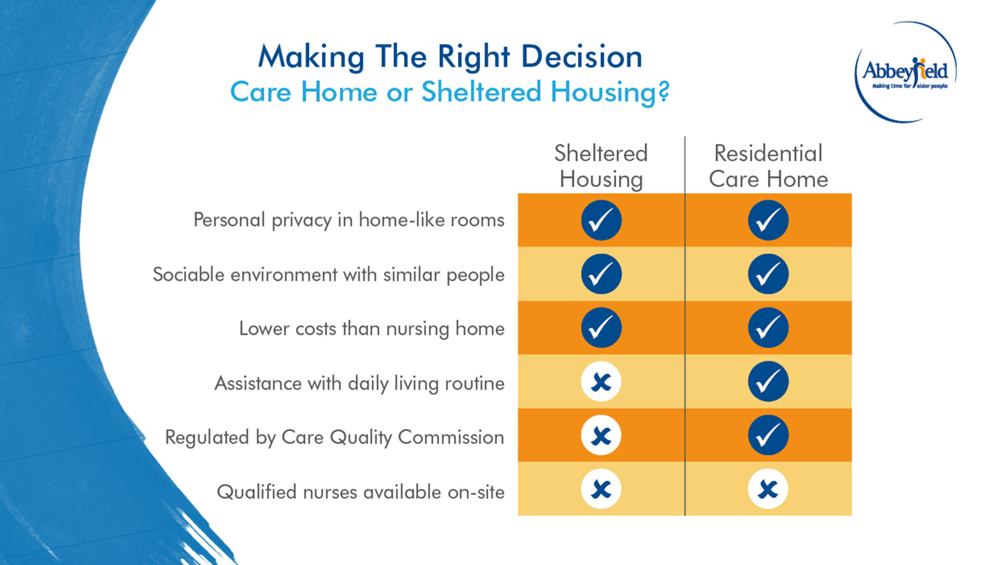 For a visual comparison between the two types of care that we’ve explained in this guide, view our Care Home or Sheltered Housing Comparison Infographic that’s available to share with family members or download and print to refer to it easily when searching for a new home.